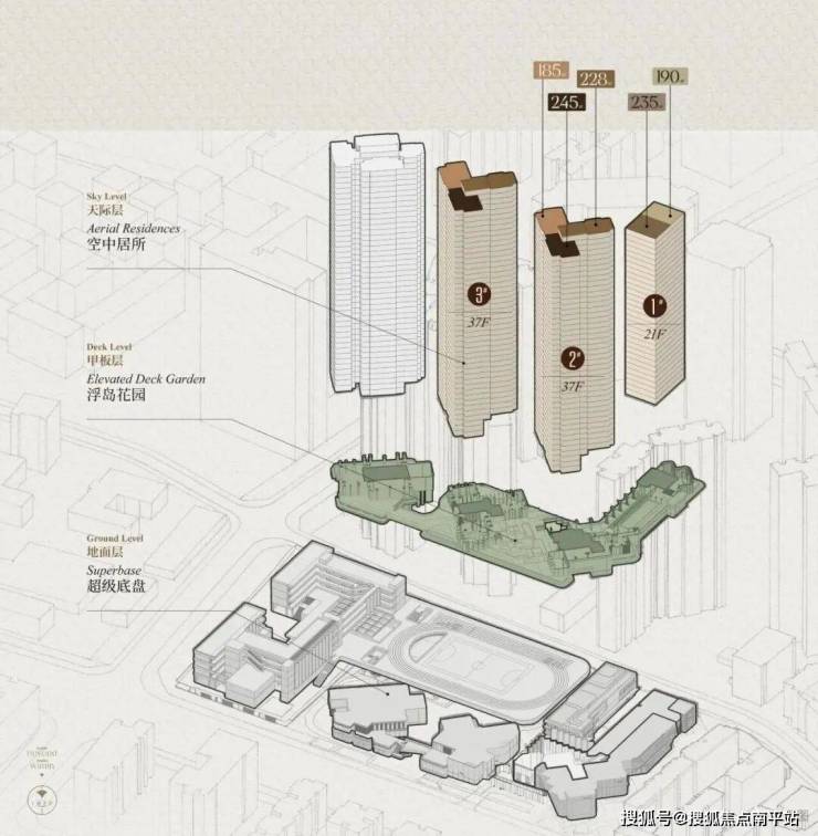 - 垂直共生模式:采用“浮岛甲板”策略,四栋住宅落于抬升的甲板层面,共享大型庭院花园,形成“超级社区底盘+浮岛绿化甲板”的垂直生态,实现底层立体花园、会所与上层居住空间的动静分离。