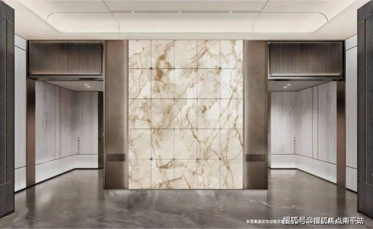 酒店式精妆双大堂设计,挑高敞阔格局,引入造型背景墙,金属与石材结合,点滴之间皆为金茂匠心。专属电梯厅,高规格入户仪式。