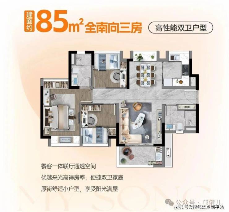 85㎡三房两厅两卫:紧凑实用,适合小家庭。