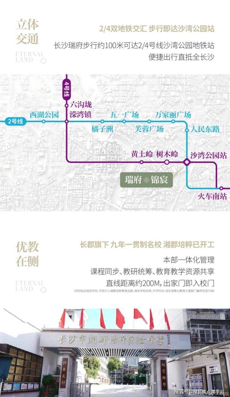 紧邻2、4号线换乘沙湾公园站,西侧约1km为4、5号线换乘圭塘站,向东最快2站可直达长沙南高铁站,“两横三纵”主干路网交织,快速串联城市核芯商圈、高铁站及机场,市内公交系统通达全城,城际交通可紧密联系株洲、湘潭。