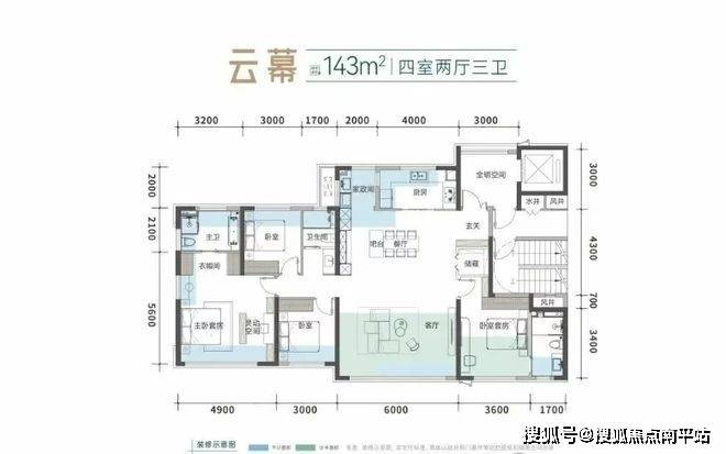 建面约143㎡户型,得房率高达112%(含私梯厅),南向面宽约19.2米,南向4+1开间设计,三卧朝南+三卫全明,三代人“阳光平权”。
