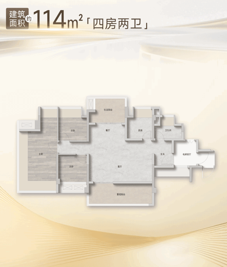 114㎡户型,拥有多功能入户花园、南北对流双阳台、270°环幕园景主卧,X空间可以在书房、儿童房、茶室之间随心切换,完美适配品位家庭的多面生活。