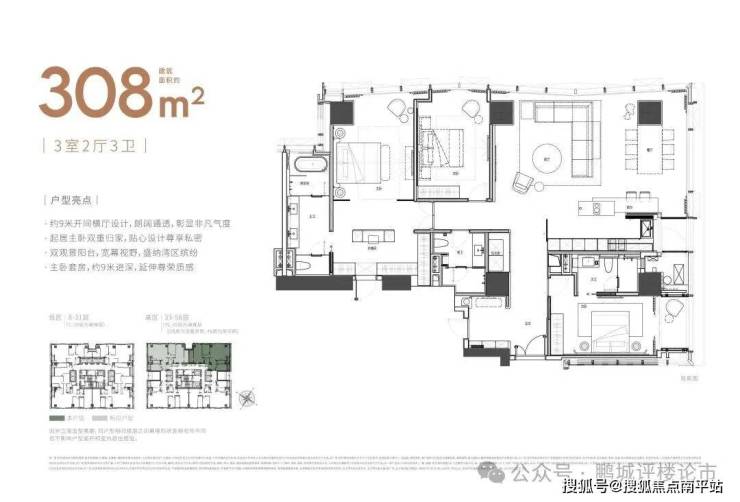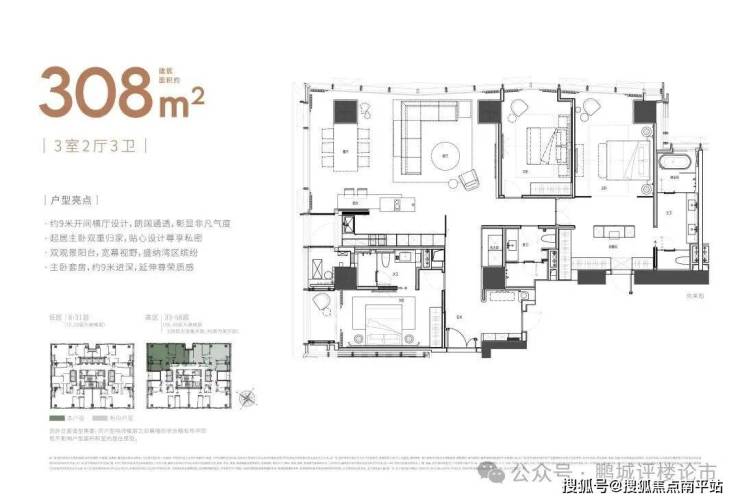 大平面大尺度定位,层高约3.6米,横厅设计确保奢阔观景面,全户型纵享环幕视野。项目打造建面约215-620㎡纯粹品质公寓,顶层为建面约1270㎡公寓产品。