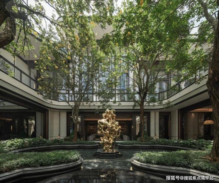 庭院空间采用创新的三重嵌套设计,精心构建出三种截然不同的情绪氛围。中心庭院的天花透光拼花窗格随日影变换,为在此交流的居民投射出斑斓光影,营造出梦幻而浪漫的氛围;凤凰廊架后方的紫藤花境,以自然植被打造出充满诗意的浪漫意境;而对称设计的狮头涌泉,则带来静谧而优雅的氛围,为居民提供一个宁静的休憩空间。