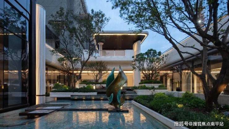 A hall-level public area system begins with an imposing grand entrance. Under the wide eaves adorned with bronze-gilded aluminum panels, layers of scalloped Scarpa steps made of beige-yellow stone create a sense of progressing arcs, making returning home feel like staying at a resort hotel. The approximately 2,100-square-meter clubhouse features an enclosed layout, with a sunken art courtyard at its center, allowing natural light and greenery to permeate the underground space, creating an ambiance of "harboring the wind and gathering energy, hidden within the city."