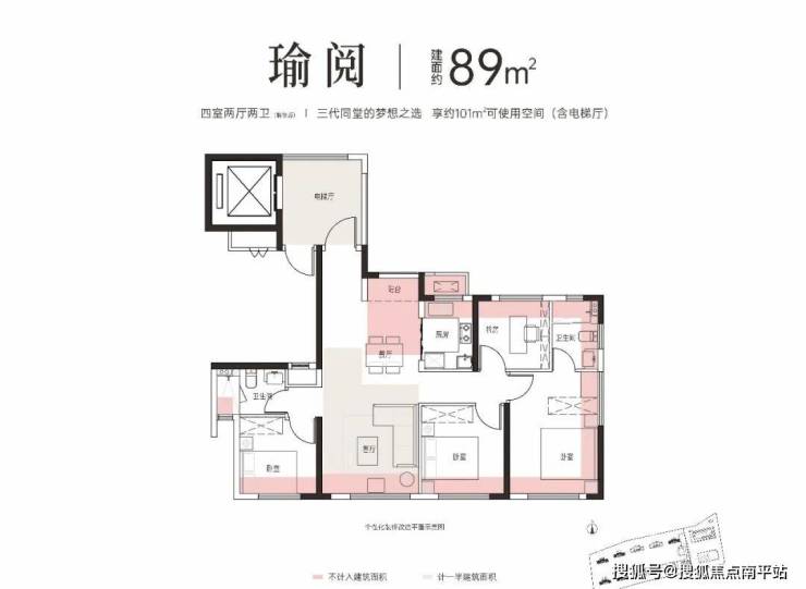 不到90平的户型,做了4房2厅2卫设计,套内可使用空间(含电梯厅)约101m²,太逆天了!