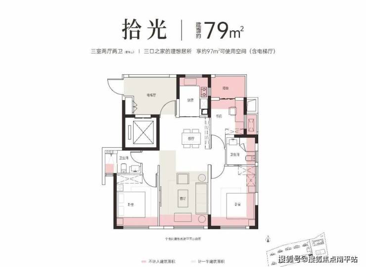 3房2厅2卫设计, 还带个小套卧,太少见了,可使用空间(含电梯厅)约97m²,