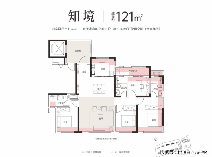 121㎡设计了4房2厅3卫,使用空间140㎡,得房率 116%,相当于老规160㎡的户型了!