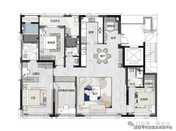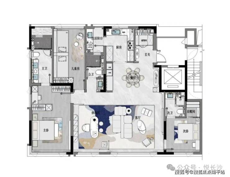 该户型实得面积约 138㎡,得房率约 114%,相当于旧规160㎡的空间感。