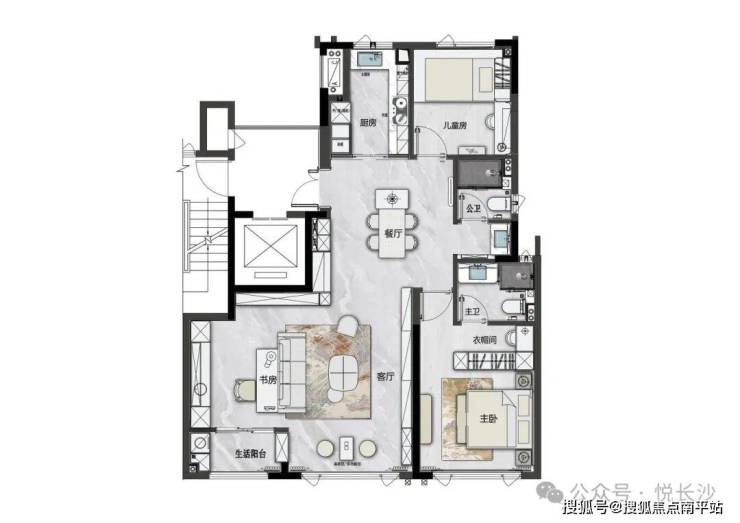 书房可改为次卧或多功能房使用,两房和三房自由切换,根据自身需求进行设计;