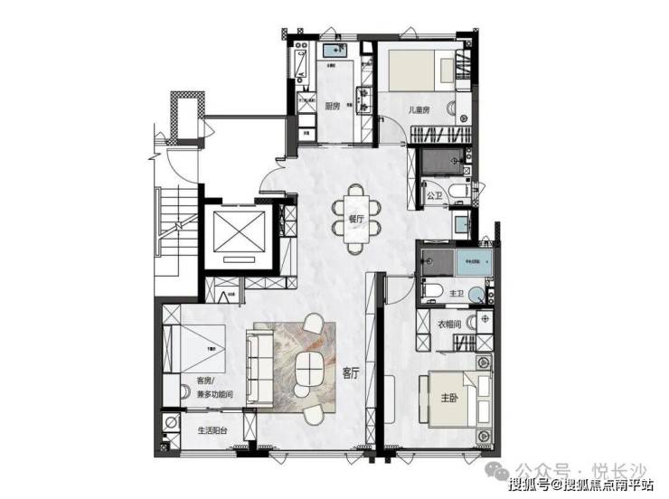LDK一体化设计,能达到旧规160㎡大平层的体验,满足家庭聚餐、社交会客、小孩玩耍等多种场景;