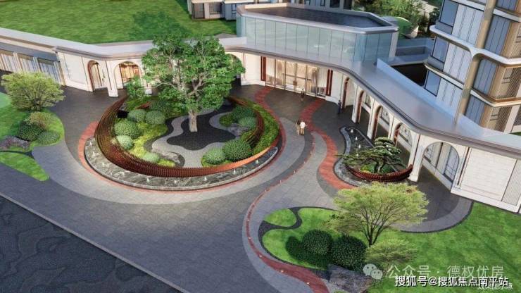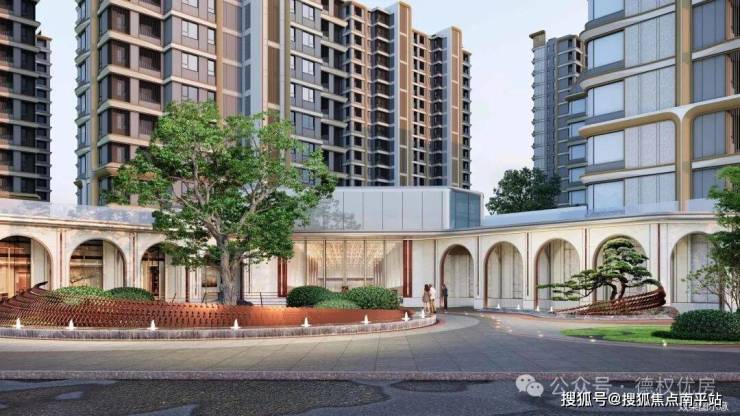 百年古树伫立门前,以金属线条勾勒鎏金门庭,大堂前庭以古树为核心,寓意凤栖梧桐,手工石材铺装地面,打造科技与自然共生的优雅格调,让归家的每一步皆成人文风景。