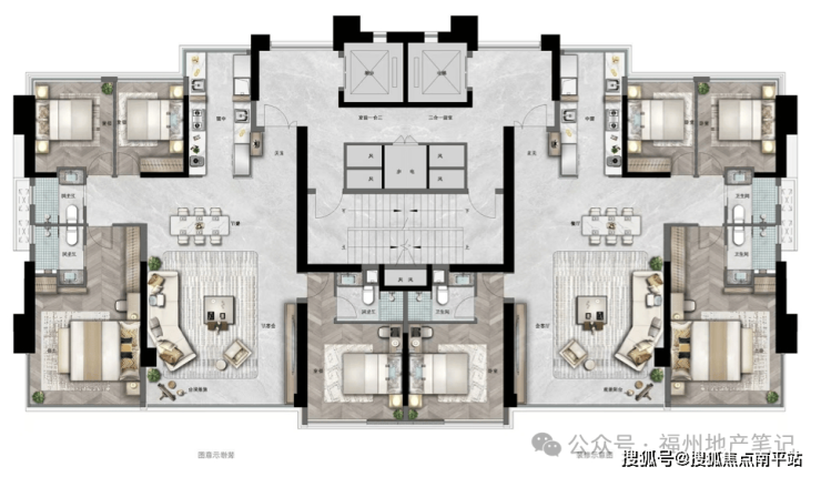 户型总体设计合理,且均做到独立电梯厅,独立玄关区等,隐私性及可用性强。其中: