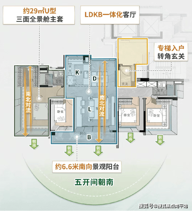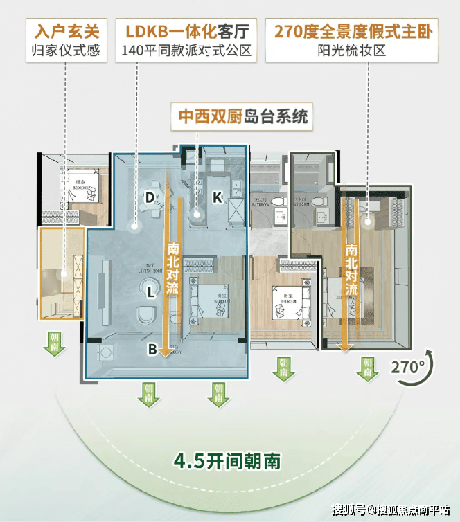 约14.7米南向面宽,餐客厅+主卧均南北通透,清风时时流连
