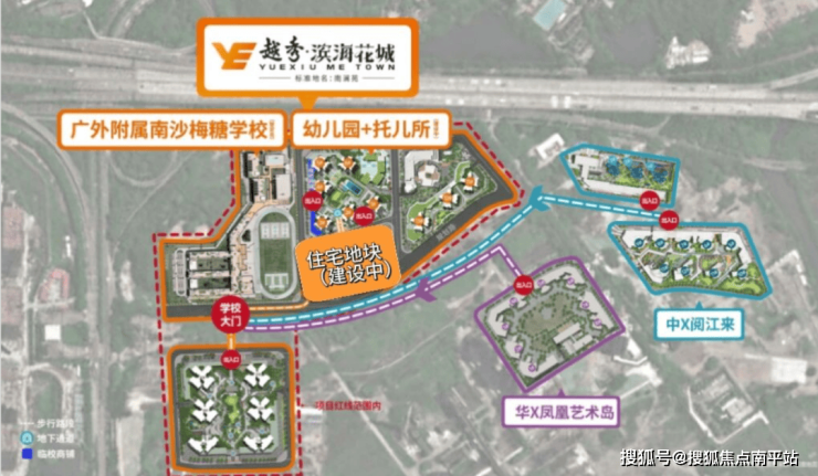 越秀・滨海花城位于广州市南沙区明珠湾板块(亭角)工业路梅山生活区南侧约 200 米(越秀梅糖项目),由广州城建开发南沙房地产有限公司(越秀地产旗下)开发,越秀物业提供物业服务(物业费约 2.8 元 /㎡/ 月)。