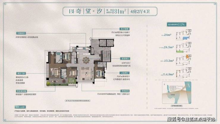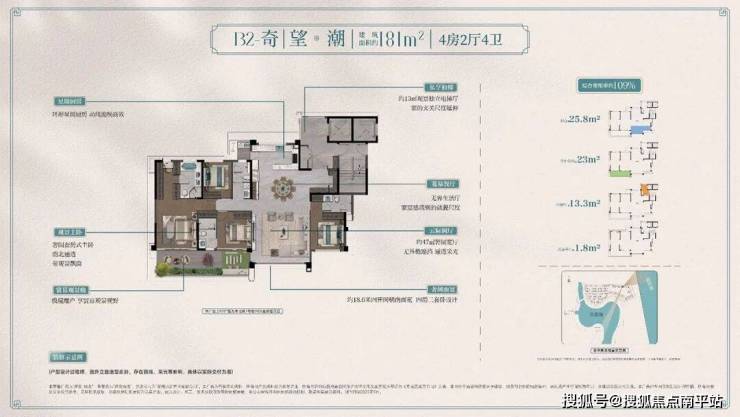 类独梯独户,享约13㎡独立观景电梯厅;约47㎡奢阔宽厅与宴会级餐厅相连,公区空间进一步扩大;约19米朝南面宽,四房三套卧且带四个全明卫生间设计,完美契合三代同堂或二孩家庭改善居住需求,其中酒店式套房主卧,不仅配备独立衣帽间+独立卫浴+观景飘窗等,还做到南北通透格局,居住舒适度高。