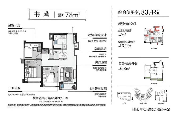 78㎡户型三面宽朝南,有独立玄关鞋柜及户外超长储物空间;