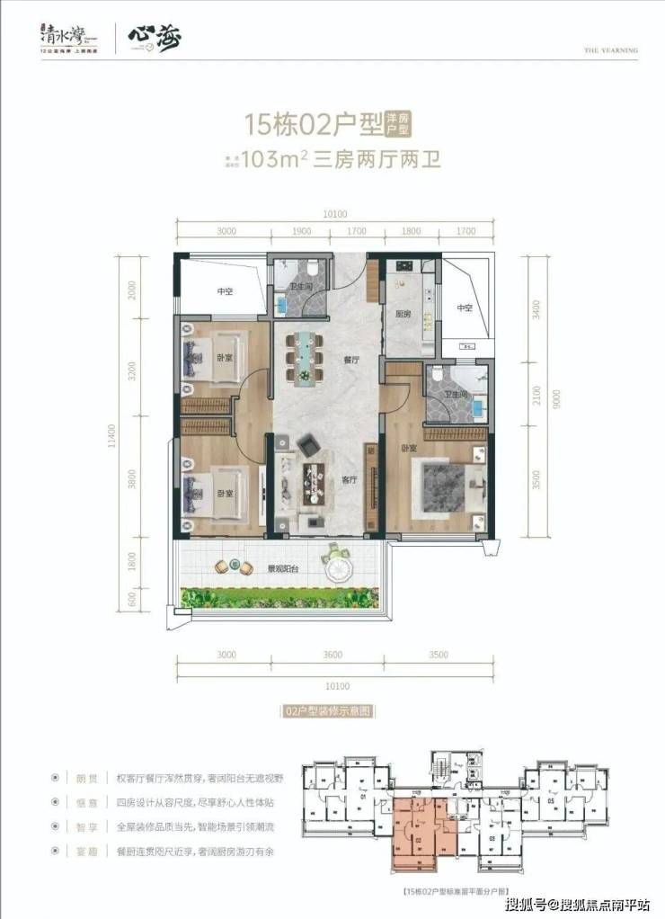15、16号楼103㎡户型,三房两厅两卫27#02、03号位104㎡户型,三房两厅两卫