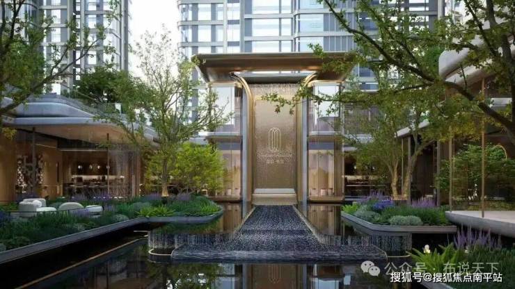 王冠状立柱于中庭耸立,营造出高门大户既视感,融合底部水景,一动一静,为业主归家增添仪式感、氛围感。