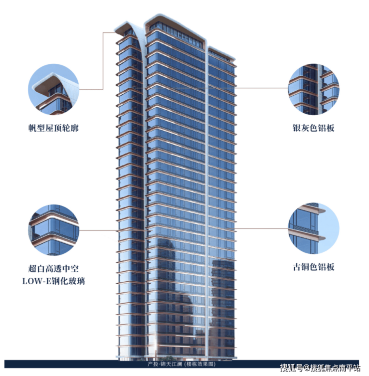 历久弥新的高颜值公建化立面,运用银灰色、古铜色铝板独一份设计了江帆全包围式塔冠(兼顾颜值与卧室隐私性),颇有“傲立江潮”意境,将赣江潮水的澎湃、江南水乡的轻柔,刚柔相济地揉为一体。