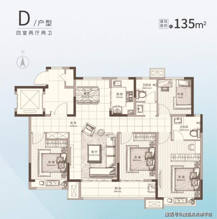 建面约135㎡四室两厅两卫户型以 “全明通透、宽境尺度” 为设计核心,打造奢阔四居空间。