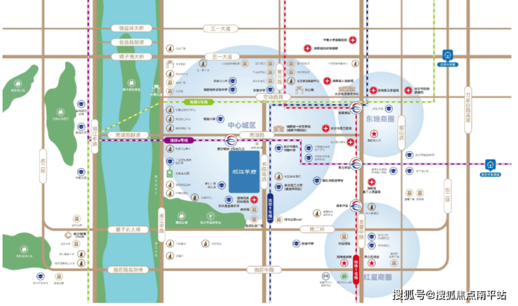 南郊公园、火车头公园、望江公园环伺,湘江风光带直线距离仅约800米,尽享自然风光;市中心医院、湖南中医药大学第一附属医院等5大三甲医院环伺,为健康保驾护航。