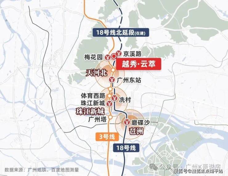 云悦二期算是一个双地铁项目。一来,家门口就是18号线京溪路站。未来业主,下楼乘坐18号线,就能一线直达琶洲(磨碟沙站)、珠江新城(冼村站)、天河北(广州东站),万博(南村万博站),根本不需要换乘。而步行约800-900米,就能到达3号线梅花园站。同样,乘坐地铁无需换乘,便能抵达体育西路、珠江新城。