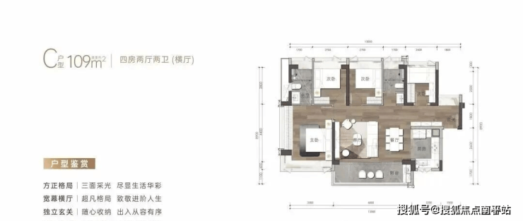 建筑面积约109㎡户型-4房2卫(横厅)
