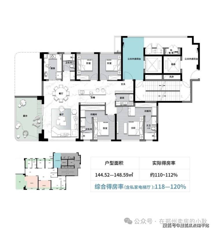 约120%综合得房率(含电梯厅)丨创新全赠送超大露台设计,突破得房率极限,实现最高120%的空间效能,让建筑空间真正为生活服务。
