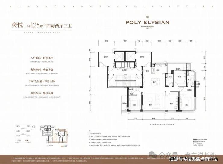 125平户型,得房率107.4%,套内面积134平,四房三卫两厅,四开间朝南,南向面宽14.6米,客厅开间5米,面积约37.8平,主卧带270度观景窗户。