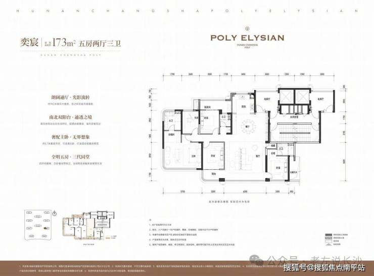 173平户型,得房率108.5%,套内面积187.7平,四房三卫两厅,四开间朝南,南向面宽19.25米,餐客厅开间6.2米,面积56.3平,有4.8平米的南向生活阳台,主卧面宽来到了5.7木,带卫生间面积达到33.7平。
