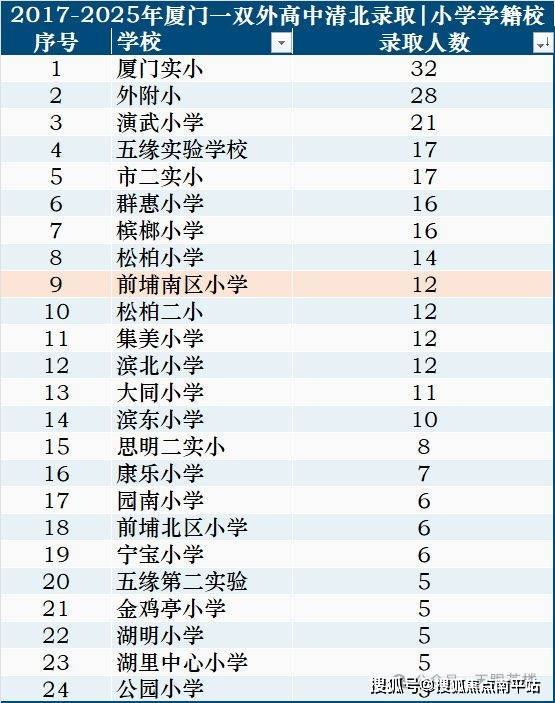 据我们跟踪统计,厦门2017-2025年共9届高考,前埔南区小学清北校友共12人,全市第9,足见前埔南区小学实力很强!