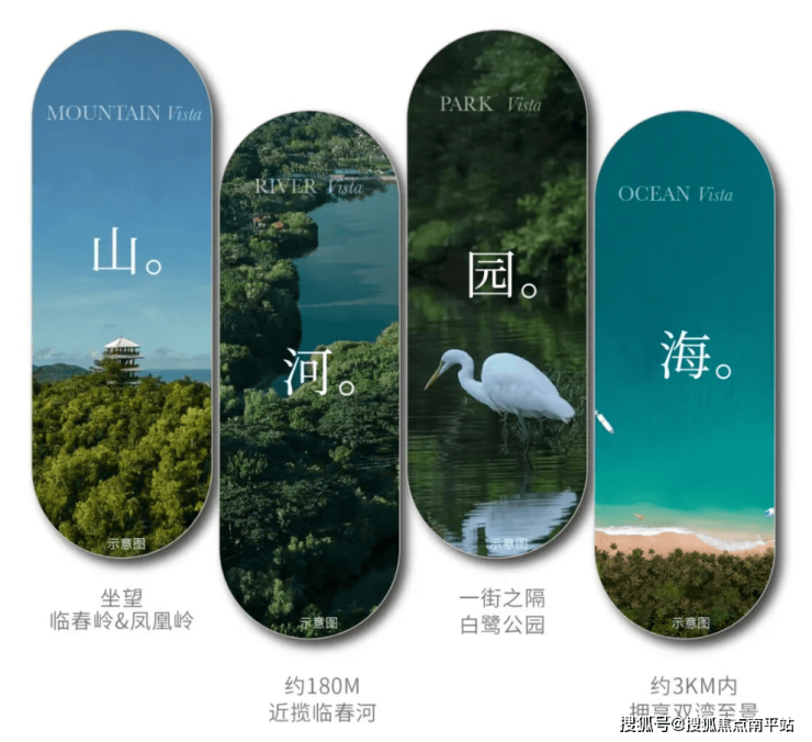 舒服,来自于被自然围合的感觉。项目处在一个被虎豹岭、临春岭、凤凰岭三山环抱的位置,这在三亚市区里很难得。按照规划,整个片区的绿地和开放空间占比超过17%。反映到生活里就是:推开窗, 临春岭的绿色是固定的背景墙;散步 约180米左右就能走到临春河边;下楼就是 白鹭公园这片城市绿肺。想看海,直线距离 约2.5公里,这个距离刚好,既能感受到海湾的氛围,又避开了临海常有的潮湿和台风侵扰。