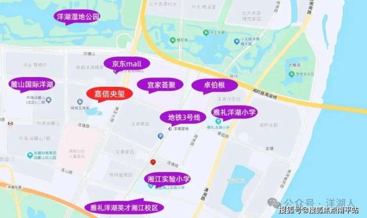 从项目出发,与 京东mall、长沙荟聚仅一路之隔,直线距离 地铁3号线洋湖湿地站3号口和 洋湖湿地公园都只有300米左右,2~3个路口即达 雅礼洋湖小学、麓山国际洋湖实验学校、卓伯根。