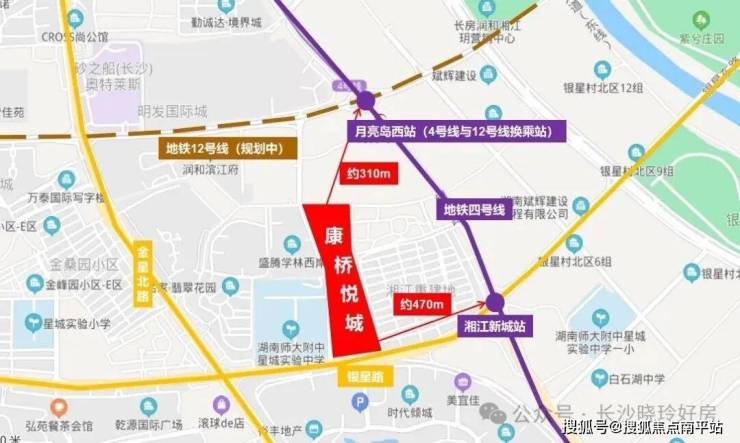 项目拥有“三横三纵三桥”的城市交通网。三横指普瑞大道,月亮岛路,银星路;三纵指金星路,银杉路,潇湘大道。三桥是指月亮岛湘江大桥、三汊矶大桥、福元路大桥。地铁4号线湘江新城站约470米,地铁12号线(规划中)与地铁4号线在月亮岛西站实现无缝换乘,距离项目仅310米。