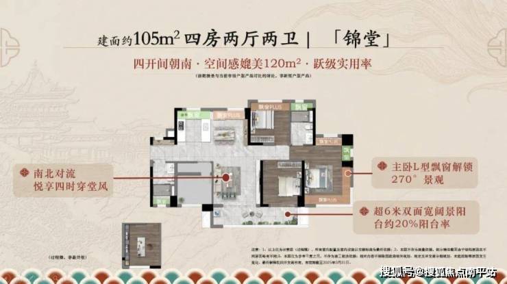 以南北对流、四开间朝南、超6米双面宽阳台、主卧带270°转角飘窗为亮点。