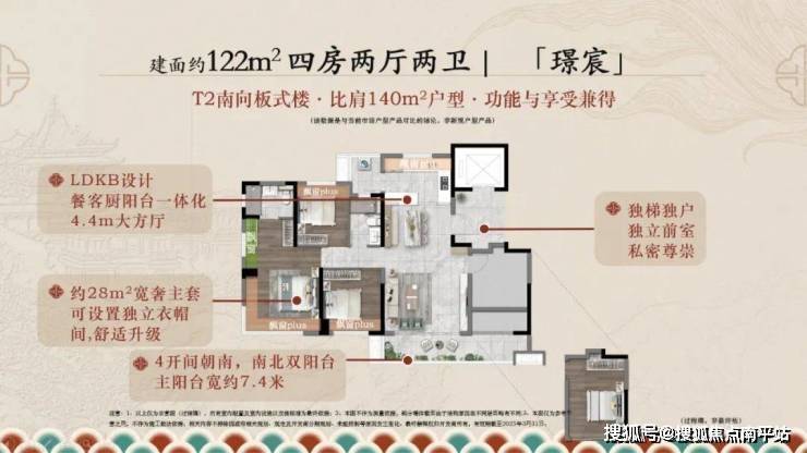 集合四开间朝南、南北双阳台、超7.4米双面宽阳台、约28㎡宽奢主卧等卖点。