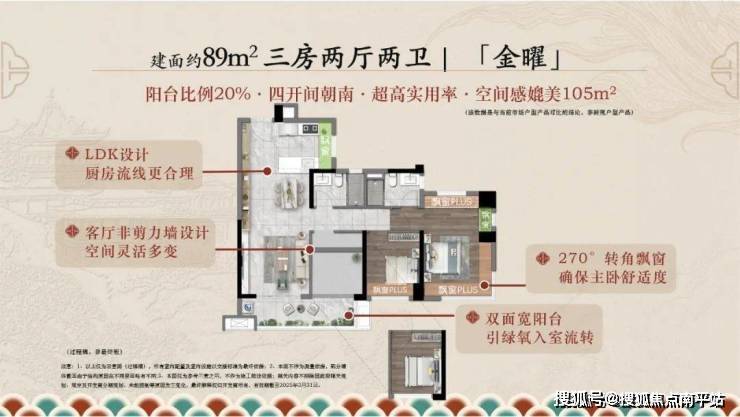 以竖厅动静分区格局、双面宽阳台、四开间朝南、主卧带270°转角飘窗为特色。