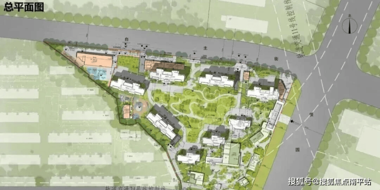 从平面图来,B地块形状不规则。北侧、东侧、南侧均为道路,西侧为现状住宅。8栋住宅呈现围合式布局,形成了比较集中的园林空间。即将首开的2、3号楼位于社区东南部,南看商业街区,西北可看社区中央园林。