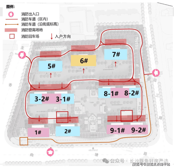 另外有点可惜的是南侧1#、2#、9#的扑救面没有甩到市政道路上去,应该是园区内做了抬高,消防扑救面放下去就楼栋消防高度超100m了。
