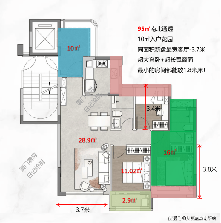 厦门还没有过这样的户型:哪怕最小面积的95㎡,都是两梯两户,而且有一个10㎡以上的独立光厅。很多厦门上千万豪宅都都做不到这两点!