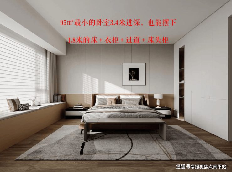 环东雲起95㎡户型,进深都在3.4-3.8米。哪怕最小的卧室3.4米进深,都能摆下一张1.8米的床,并且能容纳衣柜、床头柜、过道、窗帘等尺度。