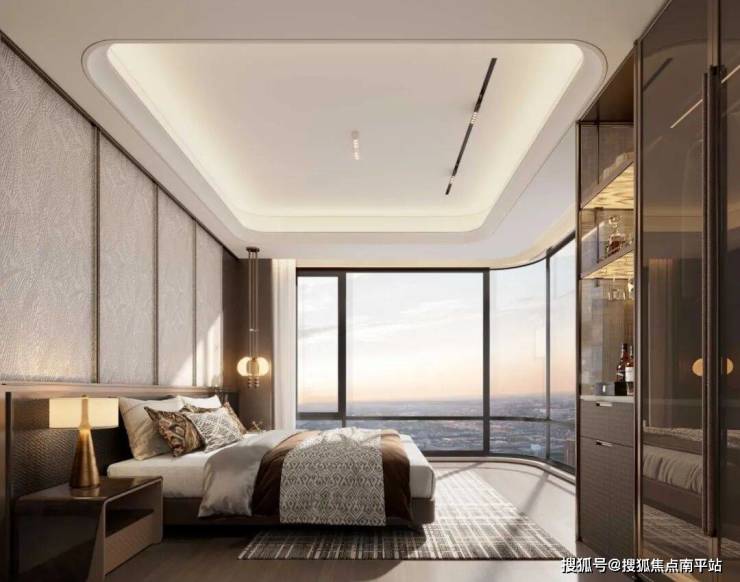 主卧就更豪华:曲面屏全景视野(转角处用的是很多岛内豪宅都舍不得用的曲面玻璃,非常昂贵,但视野无遮+颜值无限高)。主卧的尺寸也堪比酒店豪华套卧,比现有厦门项目主卧往往要大8-15㎡。收纳和光线全面提升。