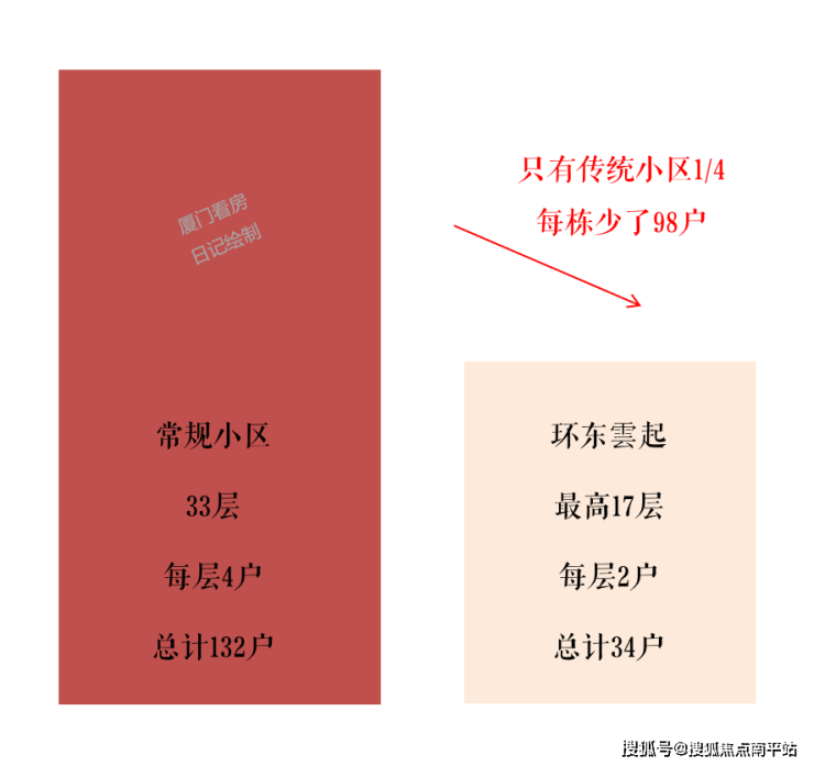 这块地的容积率接近2,堪比别墅,在厦门新盘中倒数。小区只建了300来套,最高只有17层,对比传统小区,一栋就少了98户!