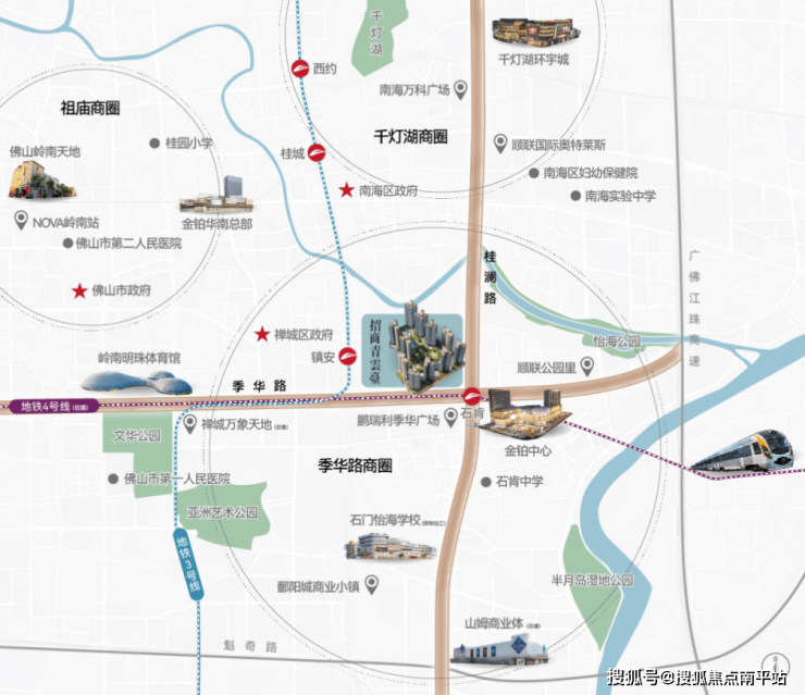 招商青雲臺的热销,更离不开对人居需求的深刻洞察与产品力的极致打磨。项目择址南海桂澜路与季华路交汇的黄金“十字”中轴,周边坐拥金铂中心、佛山环球港、鹏瑞利季华广场、山姆会员店(在建)、地铁4号线石𬒔站(在建)和3号线镇安站等配套,商业、教育、交通等资源高度聚合,构建起 “15分钟优质生活圈”,高效覆盖政务办理、商业消费、子女教育、日常通勤等需求,实现“城芯便利”与“居住静谧”的极佳平衡。