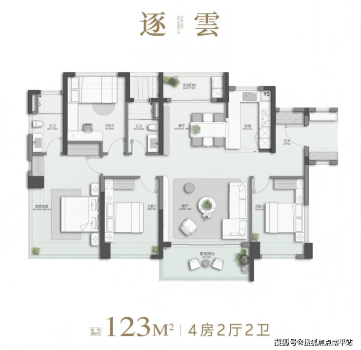 以建面123㎡户型为例,规划为四房两厅两卫,南北双阳台形成通透格局,通风采光双双拉满。LDKG一体化设计彻底打破空间界限,客餐厨与阳台无缝衔接,大幅拓宽公共活动区域,无论是家庭聚会还是日常互动都尽显从容。主卧配备270° 全景落地窗,转角观景视野无遮挡,将自然景致引入室内;即便是最小卧室面积也有10㎡以上,深度践行 “卧室平权” 理念,让每位家庭成员都能享有均等的舒适尺度与独立空间。从四口之家的成长需求,到三代同堂的天伦之乐,多元居住场景皆能完美适配。