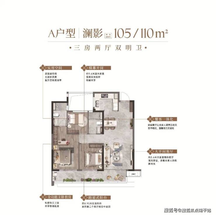 【建面约105㎡户型】打破小户型必局促的魔咒,以高利用率、高舒适度,成为年轻小家庭、刚需族的心头好。入户玄关兼具私密性与仪式感,可打造定制收纳,解决刚需痛点;约3.6米的客厅面宽开阔通透,客厅连接约8.95米长的寰幕全景阳台,采光通风拉满;U型厨房紧邻餐厅,功能分区明确、操作便捷。约9.6米的超大面宽,三开间朝南,动静分离布局清晰,卧室采光充足,紧凑实用,花刚需成本享不打折的居住体验。