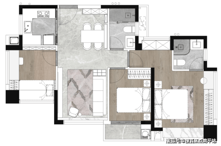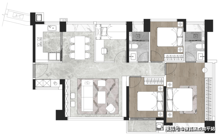 建面约120㎡四房户型,约87%套内综合使用率,空间感比肩市面其它在售产权面积超130㎡,拥有南北全通透大方厅,约14米南向大开间,主卧的超长双飘窗累计约7米长观景台。