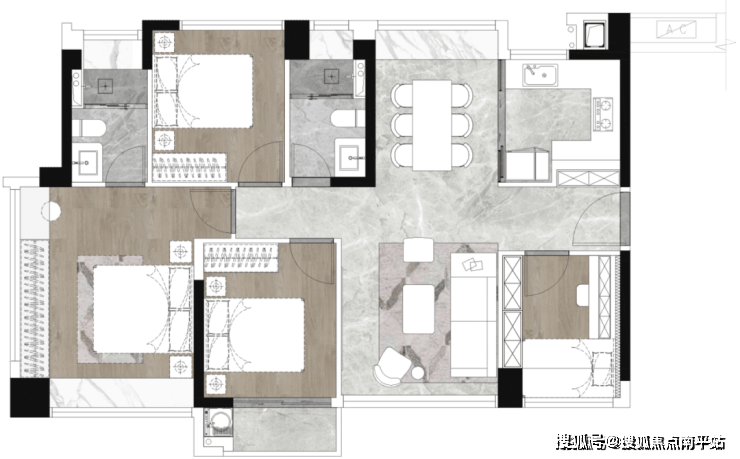 建面约108㎡三房户型设计效果图,以实际交付为准。