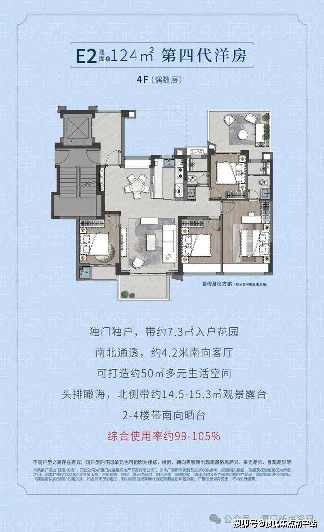 地块分为2个项目。A1地块建发湾墅,综合使用率超200%,终极改善置业,是厦门近十年唯一一个纯别墅住区。A2地块建发阅海项目四代宅(120㎡以上户型)入户花园 ,空中花园,整体综合使用率为87%-108%。